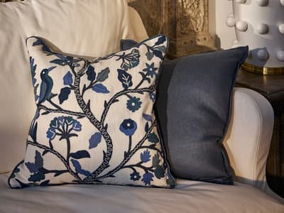 Crafted from Birdsong Delphinium, this cushion presents a cool, restrained take on woodland imagery inspired by the tapestries and decorative textiles of Britain's great halls. The front features layered tones of indigo, denim and soft delphinium blue set against a crisp linen ground, while the reverse is finished in sumptuous plain linen for a clean, complementary contrast.