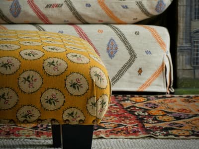 With its joyful palette and nostalgic pattern, Bobbin Sunshine is a true mood-lifter. A part of our new Kit Kemp Collection, it is inspired by needlepoint florals, this design features circular emblems of blooming pink buds framed in embroidered-style stitching, all scattered across a rich marigold yellow ground. The effect is both traditional and playful, like a vintage button box brought to life in fabric. The repeat is small and rhythmic, making it ideal for upholstery, blinds, or scatter cushions where you want a little decorative pop without overpowering a scheme. Pair with other textures and patterns from the Harvest Moon collection to lean into the folklore feeling, or contrast with crisp linens and simple checks for a fresh, homespun look. However you use it, Bobbin Sunshine delivers a sense of warmth, comfort and craft.
