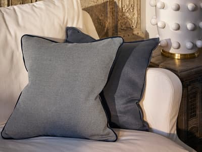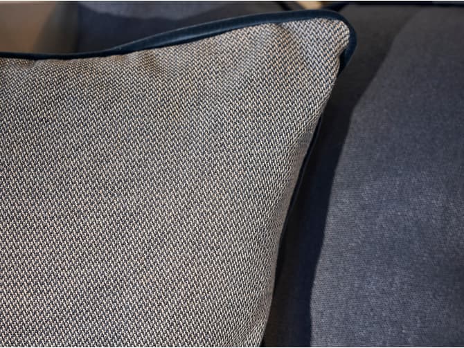 A cushion in Bomore Piemonte, a subtle and smart upholstery weave with a blue-grey tone, created by the interplay of soft blue and neutral threads, finished with piping in Medici Indigo. Bomore reflects chic Italian style and the charming cobbled streets of Portofino.
