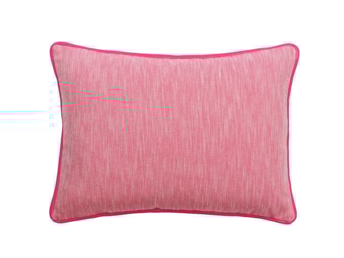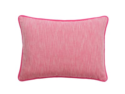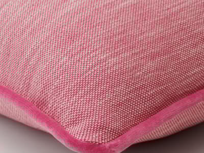 A cushion in Canvas Hot Pink, a saturated raspberry hue given sophistication by a slubby linen texture, piped in complementary Medici Geranium.