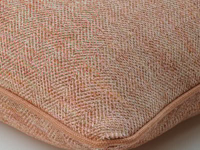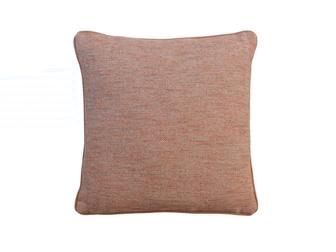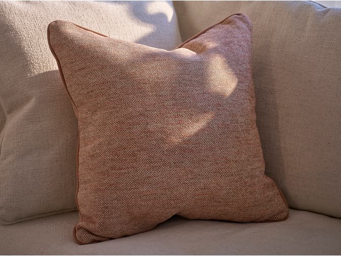 A cushion in Delphini Amaretti, a thick and slubby weave with a subtle herringbone in a warm amaretti-inspired mix of terracotta, burnt orange, and soft beige, with subtle flecks that enhance its richness, finished with piping in Rocco Plaster.