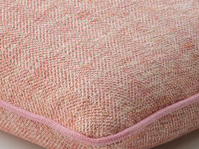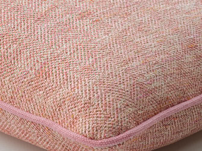 A cushion in Delphini Dolce, a thick and slubby weave with a subtle herringbone, featuring a soft terracotta-pink base with interwoven flecks of red, orange, and blush, giving it a layered, lively depth. Finished with piping in Rocco Petal.