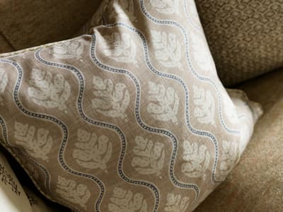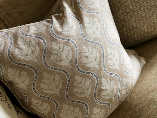 The Fig Stone cushion transforms the natural rhythm of fig leaves into a softly curving, hand-drawn motif that feels both structured and organic. Its delicate repeat adds subtle movement to interiors, evoking the stillness of leaves pressed against a weathered wall. In the Stone colourway, muted taupe and clay tones are paired with soft ivory and blue, creating a timeless neutral palette that blends effortlessly across traditional and modern schemes. This cushion is a versatile choice, adding depth and refinement without overpowering a space, making it ideal for layering with plains or bolder patterns.