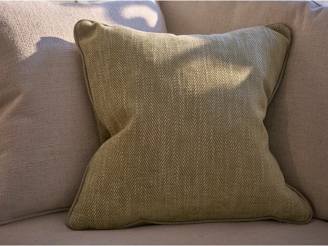 An exceptionally soft chenille cushion made from Summit Sage, a two-tone herringbone in golden ginger hue and piping in Rocco Sage. Summit cushion mixes a classic, sophisticated design with a casual and slubby weave, recreating the natural charm of Portofino as well as its illustrious following. Cushion pad included.