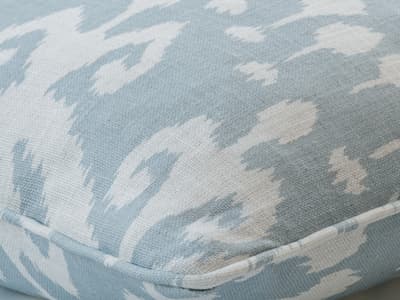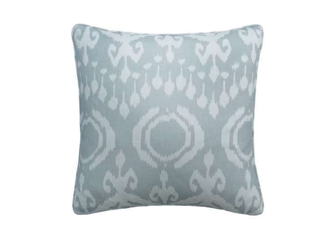 Volcano Powder is a bold yet elegant ikat design in cool blue with contrast piping in smart, textured velvet, Mossop Stone. Handmade in the UK and filled with sustainably sourced duck feather and down.
