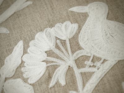 Learn moreBirdsong Ivory is an understated expression of medieval woodland scenes traditionally woven for Britain's great halls, embroidered in soft ivory on a natural linen ground.