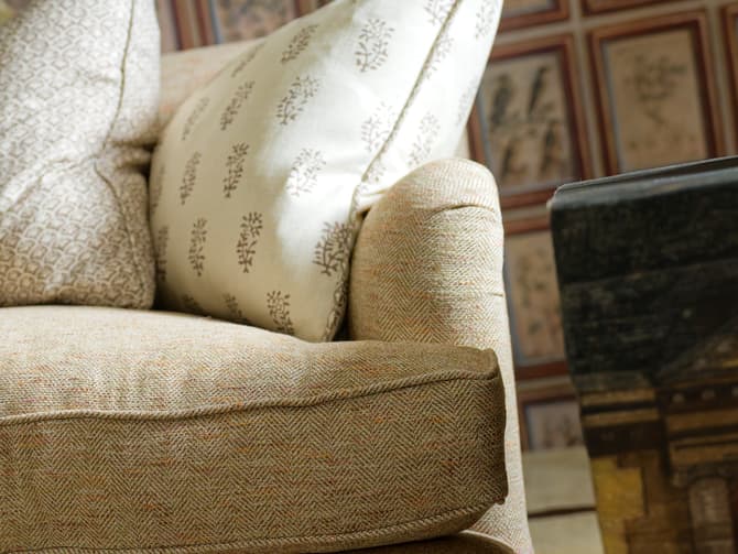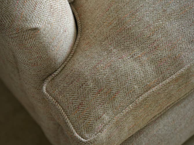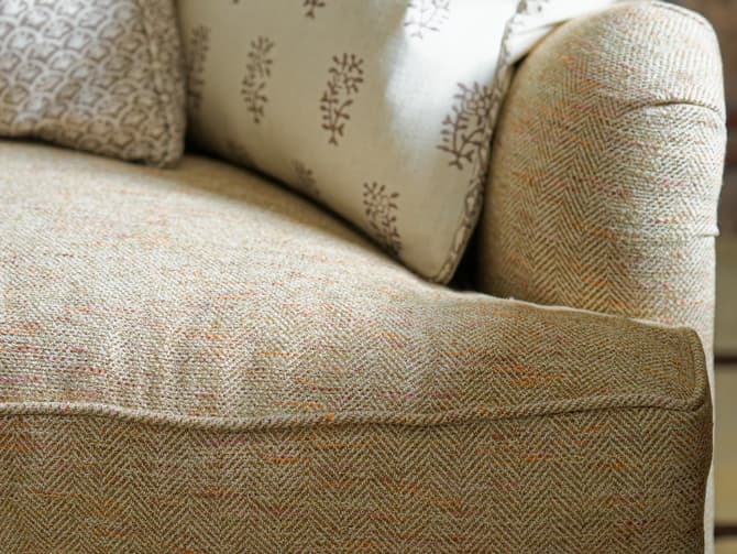 A thick and slubby weave with a subtle herringbone with flecks of warm orange, pink, and even a touch of rust.