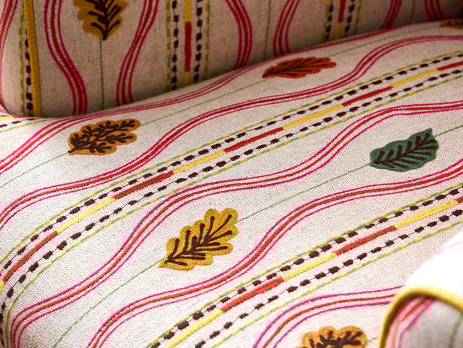 colourful descent with embroidered oak leaves in rich berry reds,