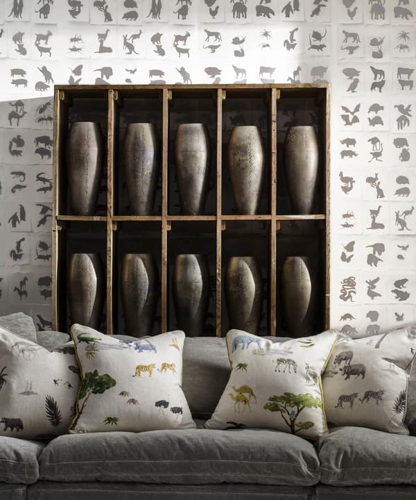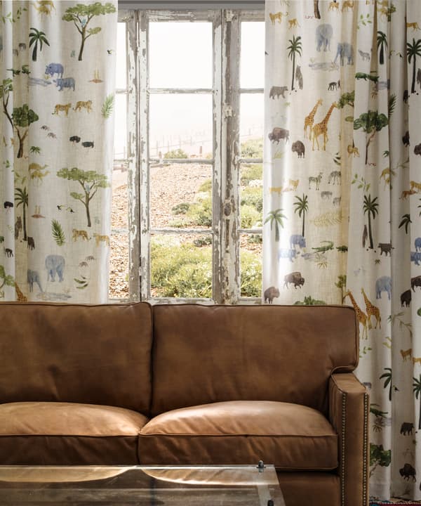 This is the lead fabric design of the Holly Frean collection. Lions, tigers, zebras and even dodo's feature in this enchanting safari scene. The design was painted by hand by British artist Holly Frean and digitally printed onto linen.