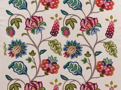 Embroidered onto a crisp white linen ground, the pattern unfolds