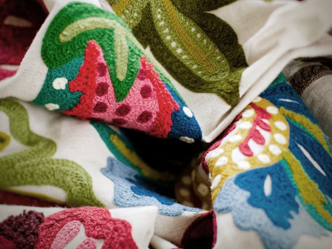 hues of red, saffron, teal, emerald and soft blue lend energy and