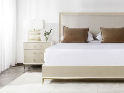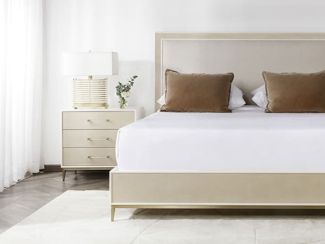 The Alice expresses understated opulence with a frame of faux shagreen supported by a brass finished base and softened by the linen upholstered headboard.
