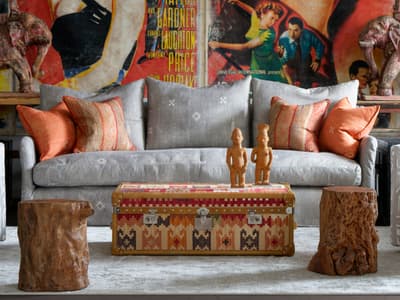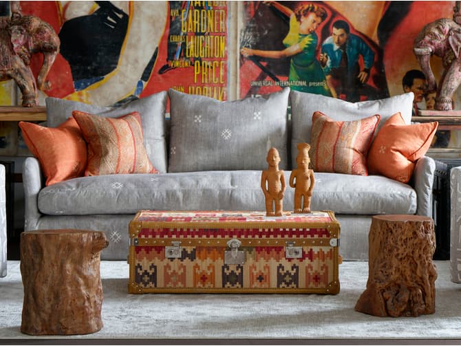 Learn moreA unique, kilim, trunk-style coffee table with brown leather trim and side handles, metal trunk clasps and stud detail. It's a practical storage unit and coffee table that adds vintage travel flair to a room in warm carpet colours. Pair with a sink-in leather armchair to complete the look.