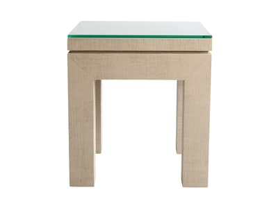 This Paladin side table features a cream-colored base with a subtle textured finish and a clear glass top.