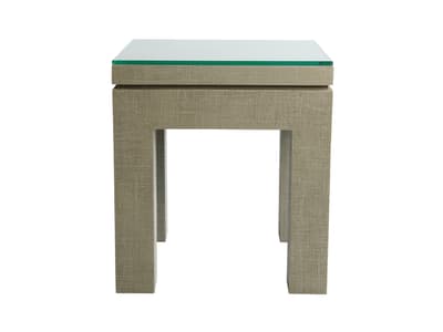 This Paladin side table features a cement-grey base with a subtle textured finish and a clear glass top.