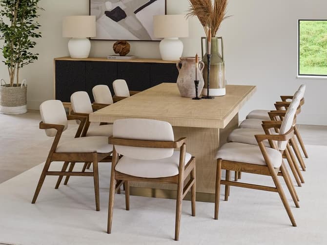 Learn moreThis versatile extending dining table exudes informal elegance and a relaxed aesthetic. Raffles boasts an interesting mix of textures with rough sawn, natural ash veneer and brushed brass accents, suited to be paired with a range of dining chair styles. This dining table comfortably seats six people (183cm width), or up to ten (243cm width) when extended and the extension can be stored within the table.