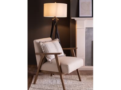 A rustic floor lamp that stands like the legs of an easel, Tripod in dark wood features authentic metallic screws and an oversized linen shade. Designed by lighting icon E.F. Chapman, place in the corner of a living room or kitchen to add relaxed character.
