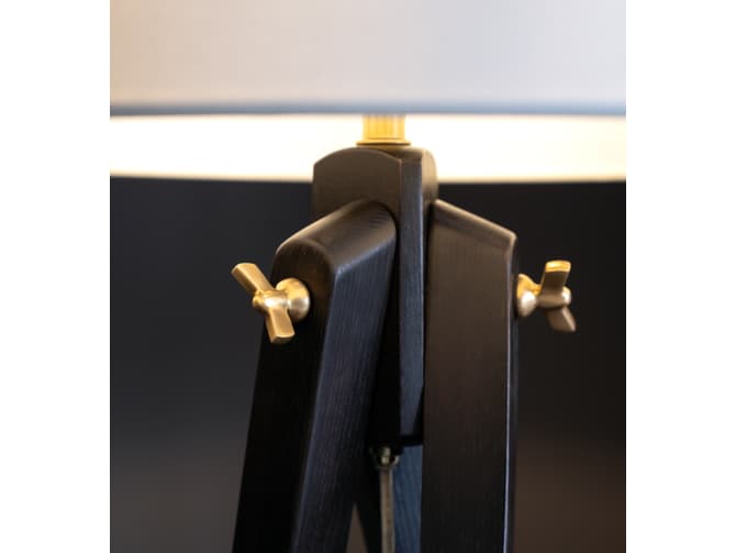 A rustic floor lamp that stands like the legs of an easel, Tripod in dark wood features authentic metallic screws and an oversized linen shade.