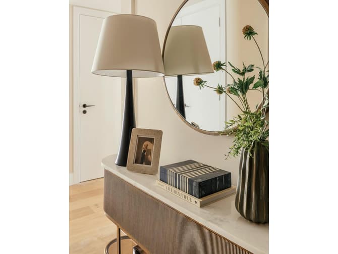 Learn moreA dark grey iron table lamp with a white linen shade, Dover exudes dark glamour. Crafted by AERIN, with signature unique design flair, Dover features trumpeting base adding shapely, feminine interest to a room.