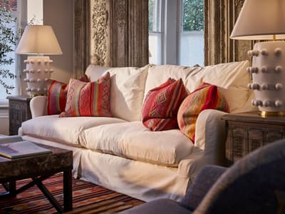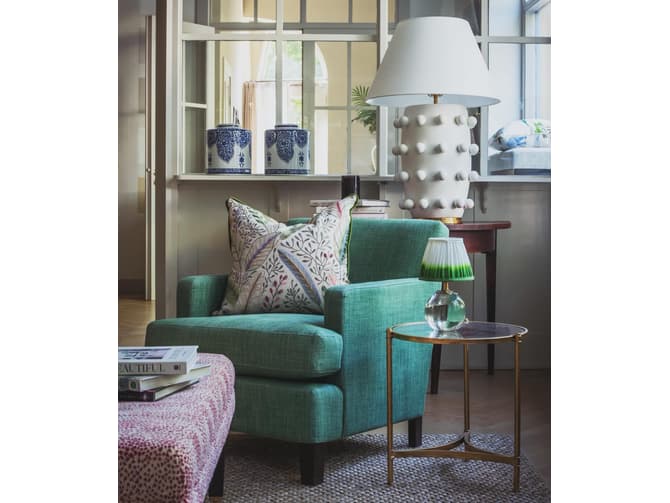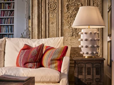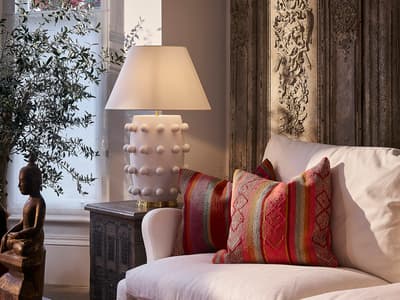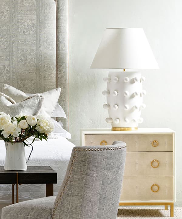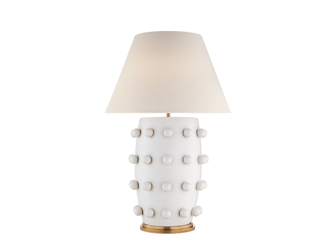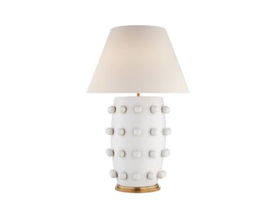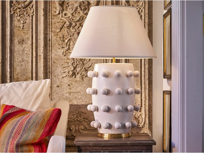 Learn moreA matte white table lamp decorated with white bobbles, a large linen shade and antique brass fixings. Linden, crafted by the iconic designer Kelly Wearstler, adds unique character to a room in the shape of humour, texture and funky form. Available in two sizes.