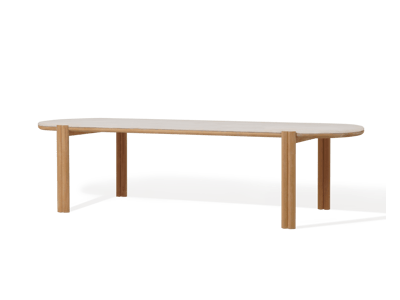 The mixed-material Cove Pill Dining Table anchors your outdoor dining experience - featuring a solid Indonesian teak framel with a solid organic travertine stone top.