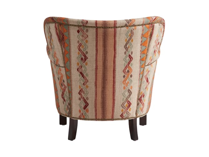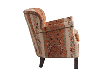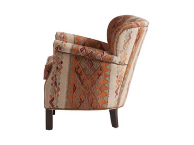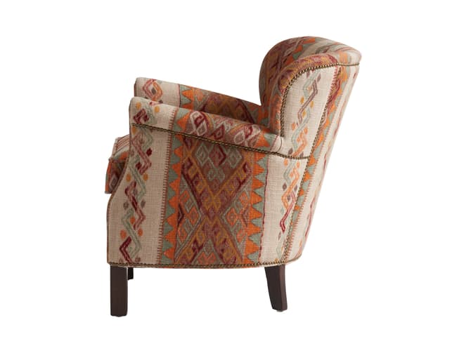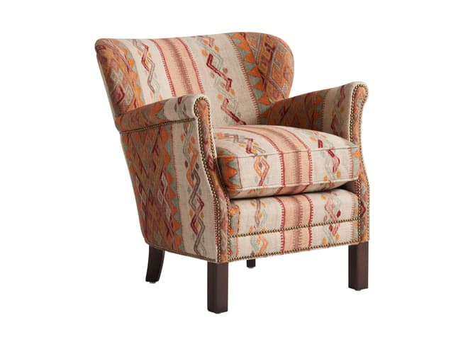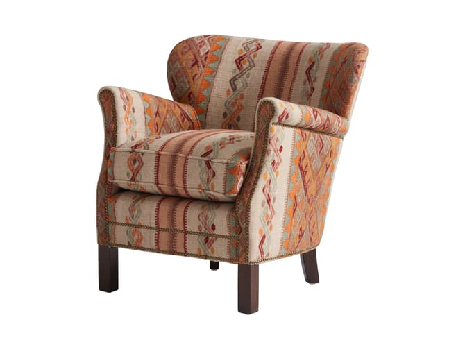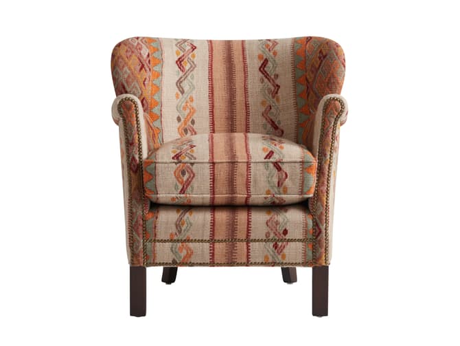 Learn moreThe Harrow armchair retains its compact, enveloping shape, designed for relaxed, comfortable seating. Upholstered in the Frida Sunset fabric from the Kit Kemp Collection, it features a richly detailed jacquard pattern with folkloric-inspired motifs in tones of rust, turmeric, coral and rose pink, set against a natural ground.