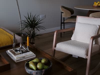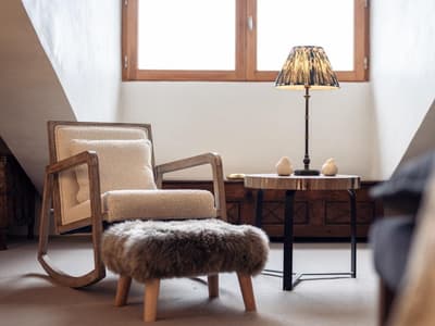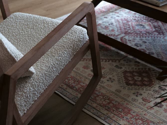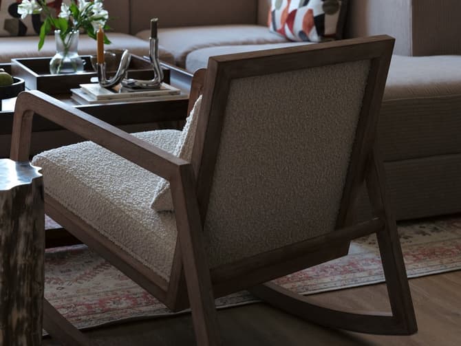 Learn moreJed is a modern reimagining of a traditional rocking chair with a low, square back and smart, mid-century style wood frame. The light stained wood is complimented by a sumptuous boucle style, cream fabric, a combination inspired by chic skandi interiors for a clean and organic feel. Accompanied by a small rectangular cushion for extra comfort.