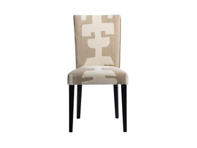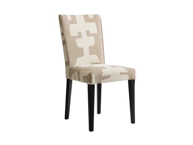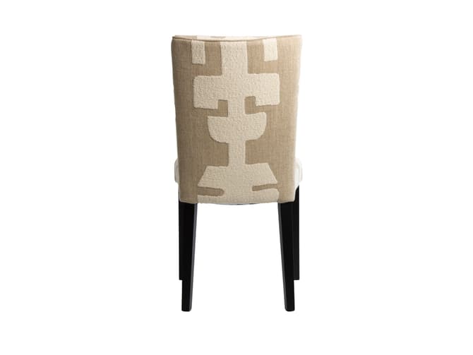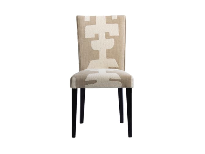 This smart dining chair boasts a sleek and simple silhouette, with a tall backrest for additional comfort and grounded by dark wenge legs. Upholstered here in Peru Ivory, a soft boucle yarn with a striking design reminiscent of a Totem pole.