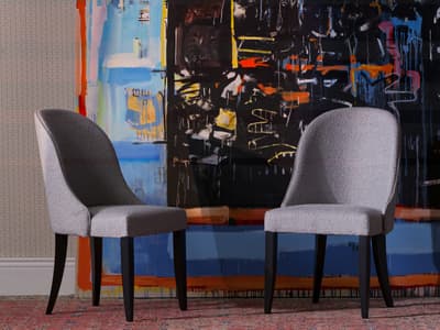 A comfortable dining chair with padded seat, full back rest and dark wood legs that are slightly tapered at the back. Aldwick has been upholstered in our Huntsman Cloud fabric, a chic, textured boucle in contemporary grey. Its wonderfully curved back is complimented by grey velvet piping. This simple and classic design is both elegant and versatile.