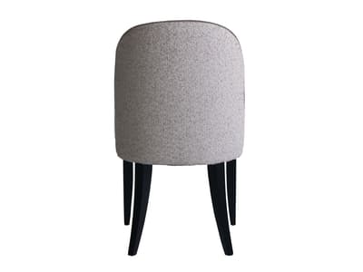 A comfortable dining chair with padded seat, full back rest and dark wood legs that are slightly tapered at the back.