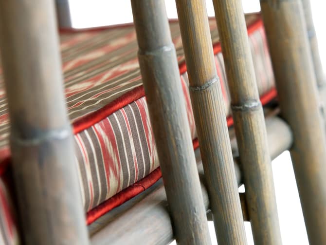 The seat is a showstopper: a cushion upholstered in 100% Thai ikat silk, chosen for its bold pattern and rich texture.