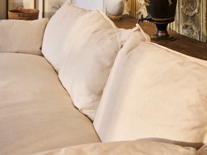 The single bench seat cushion provides uninterrupted comfort, filled with the softest goose feather and down for an enveloping, sink-in feel, wrapped around a premium foam core. Three generously proportioned back cushions, filled with a blend of feather and fibre, deliver layered comfort and relaxed support.