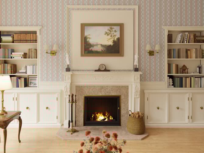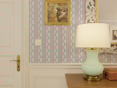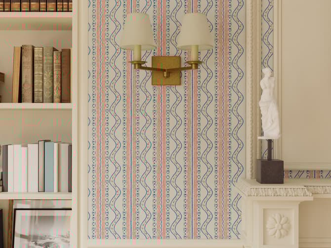 Flow Brook, in collaboration with Kit Kemp, strikes a lively balance, pairing deep navy stripes with coral-red bands and floral waves, creating a wallpaper that brings vibrancy, rhythm, and a handcrafted feel to any interior.