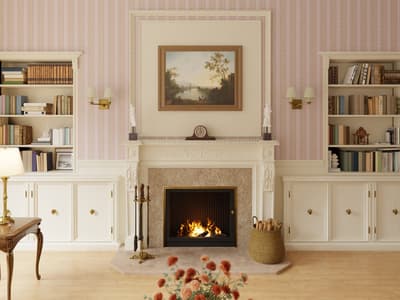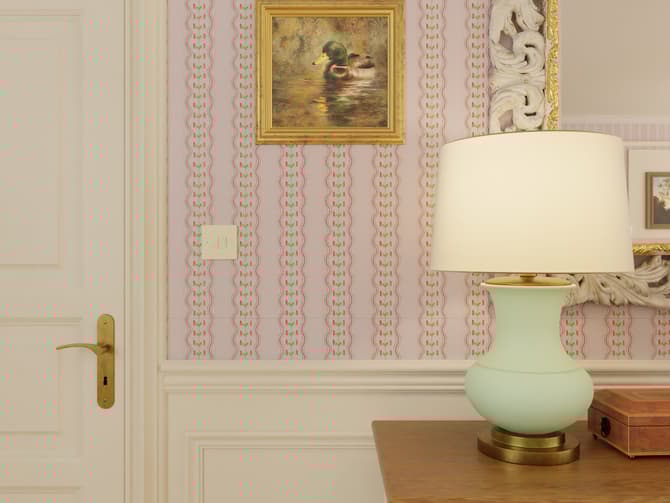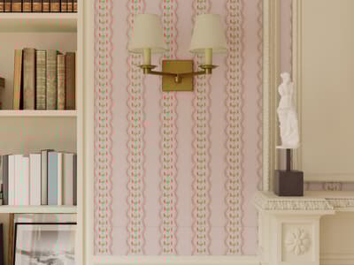 Romantic and spirited, this wallpaper in collaboration with Kit Kemp, combines blush tones with sprigs of coral red and fresh green, creating a charming backdrop that feels both nostalgic and joyfully fresh.