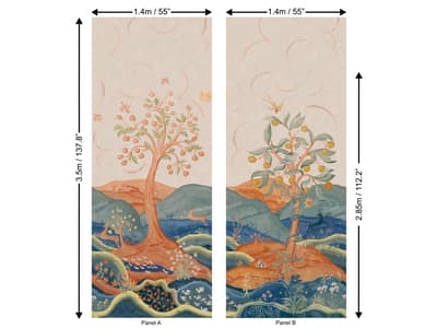 The Mist colourway uses pale grey-blue and faded terracotta to create a serene, almost ethereal mood. The tones are softer, cooler, and quietly confident, like moonlight on linen or mist rolling across distant hills. Painted clouds drift across the panels, while small pastoral scenes unfold if you take a moment to look.