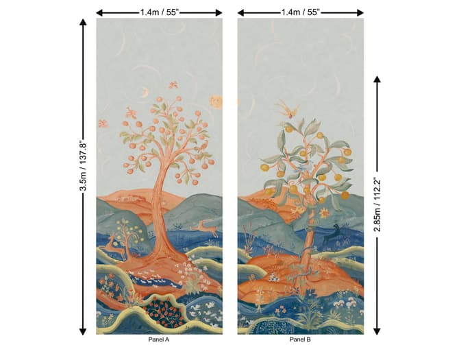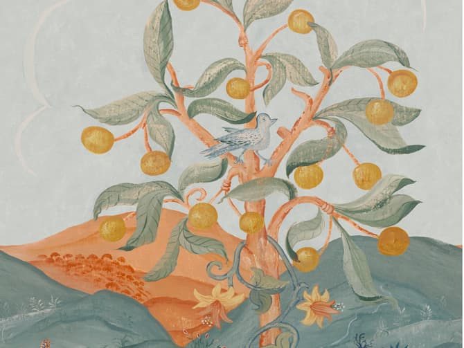 Bathed in golden peach tones and alive with painterly texture, Rufus Summer, in collaboration with Kit Kemp, is a mural that feels like sunshine made visible. The scenes are lively and lyrical, orange trees curve towards the sky, curious birds perch mid-song, and the landscape rolls on in painterly waves of coral, ochre and rich blue.